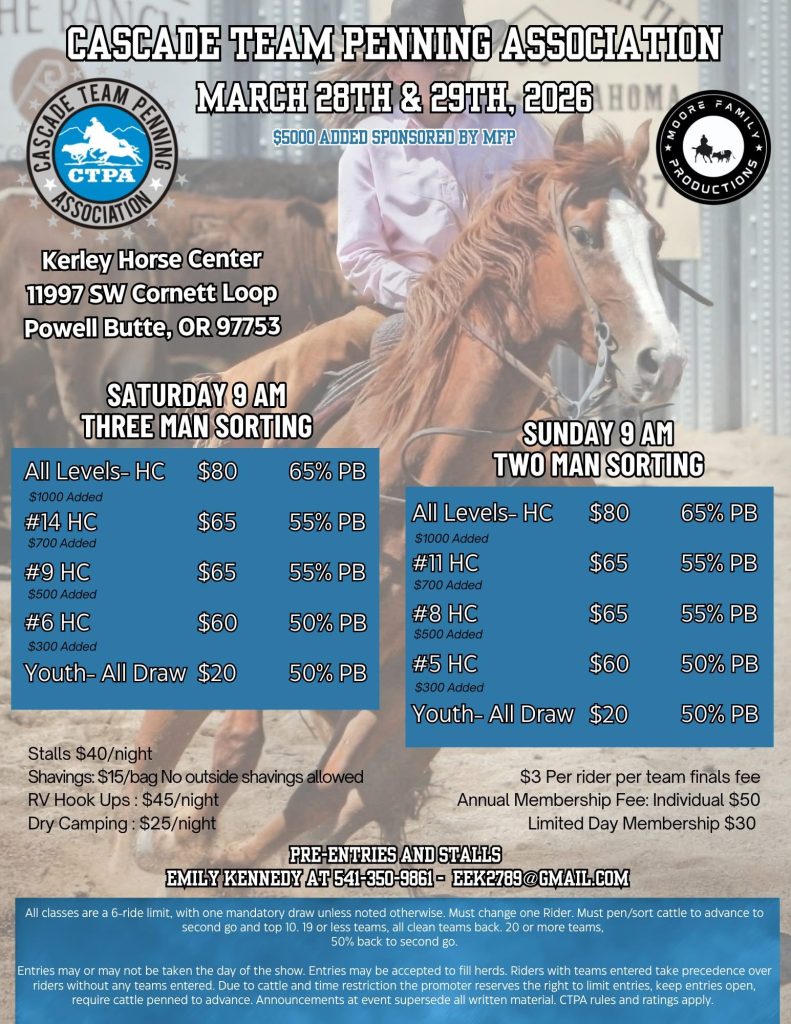 Cascade Team Penning Association (CTPA), was organized as a non-profit corporation sport club in March,1990. We’re dedicated to celebrating and promoting the exciting sport of team penning and sorting. Nestled in the heart of the Pacific Northwest, we serve as a vibrant community for enthusiasts of all skill levels, from novices to seasoned professionals.